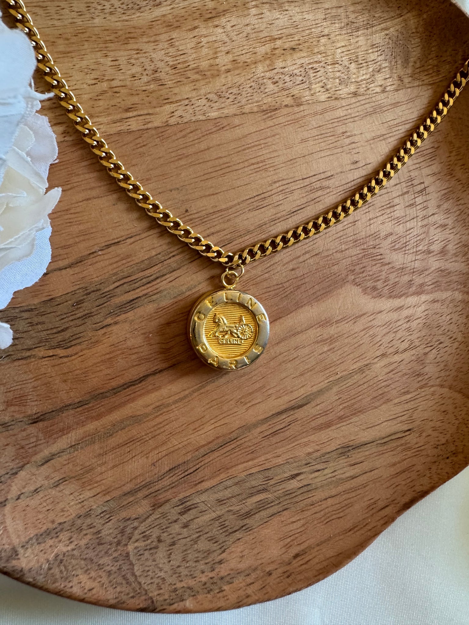 Bouton CÉLINE monté en pendentif sur une chaîne en acier inoxydable